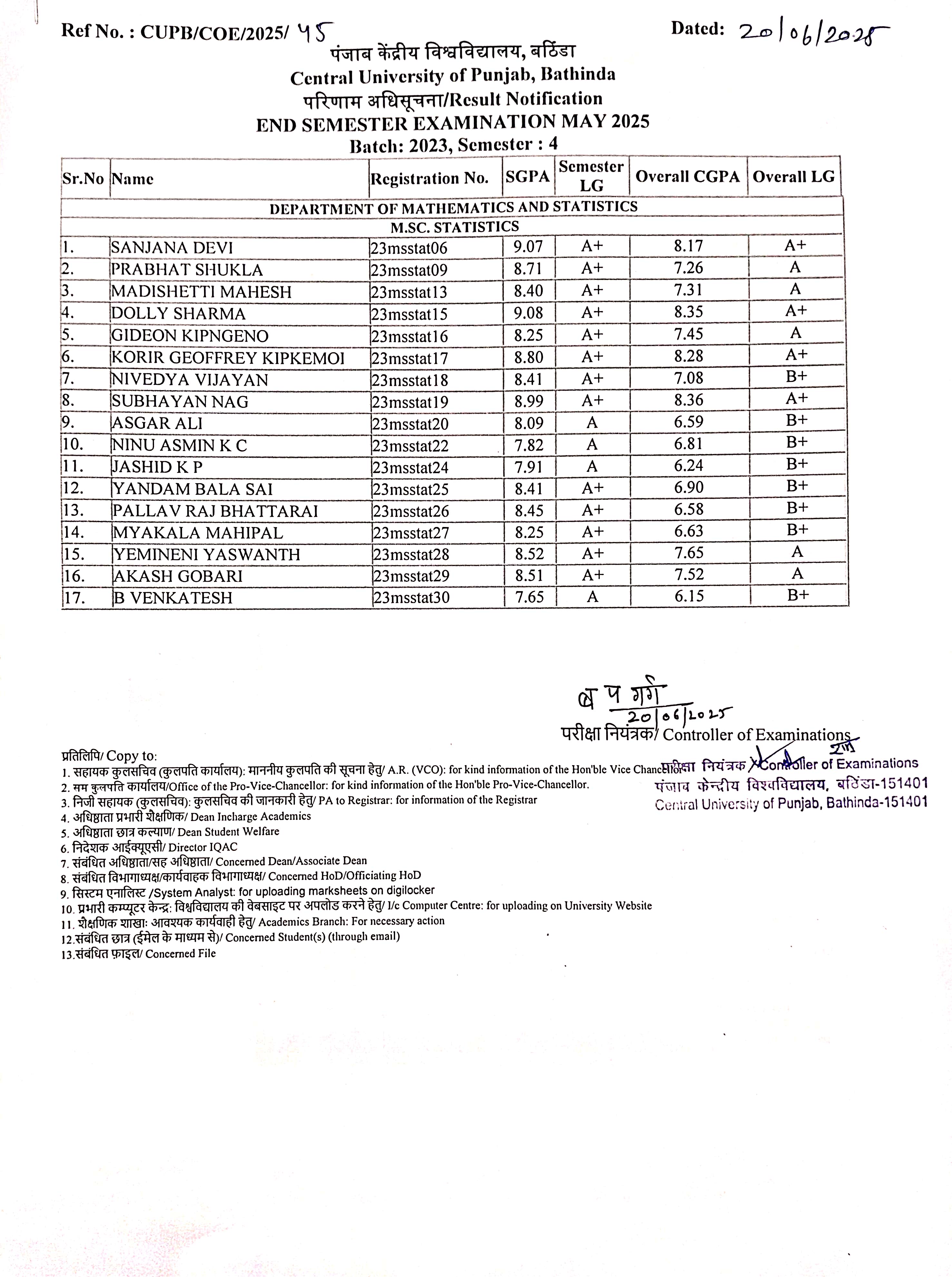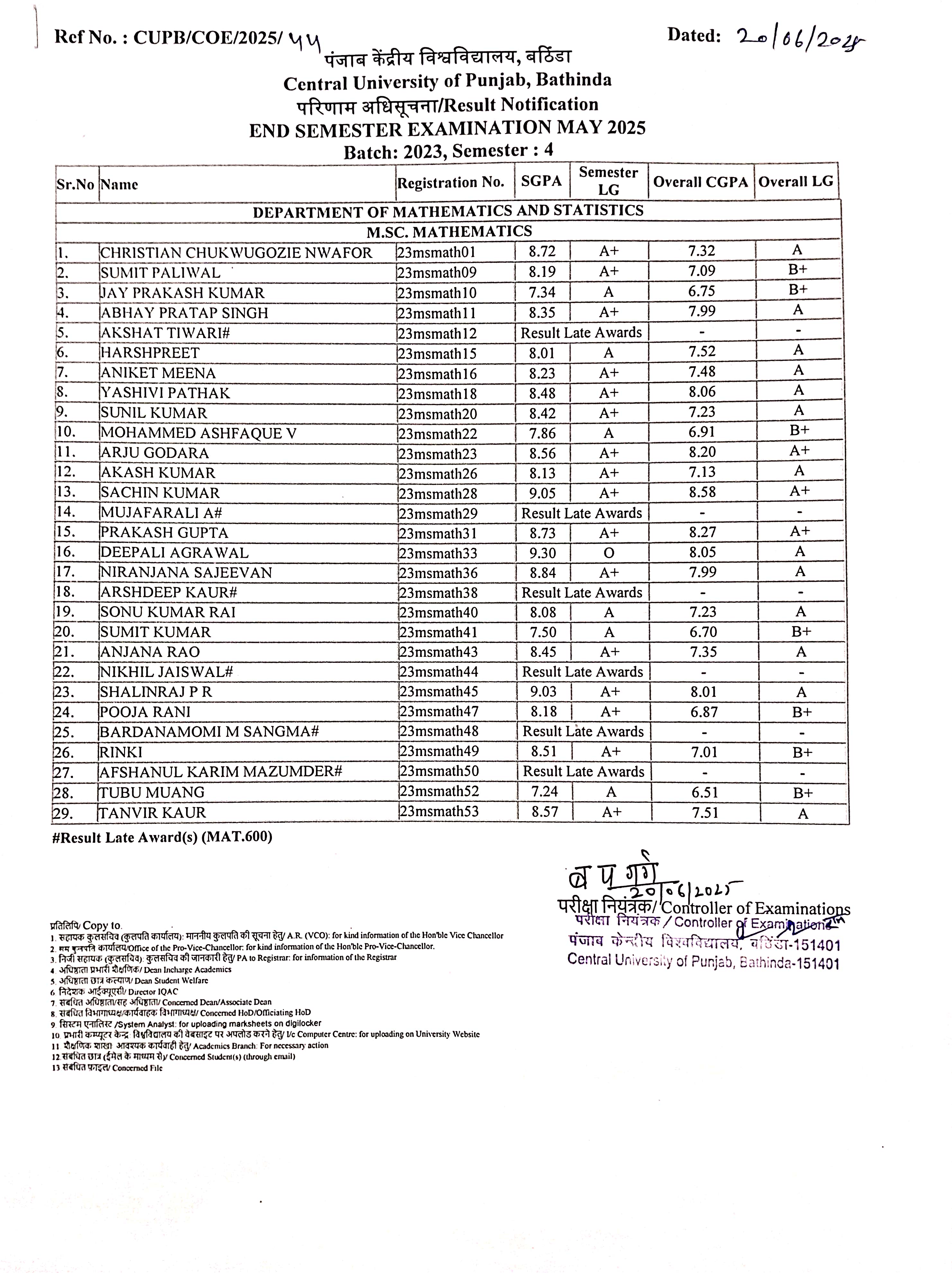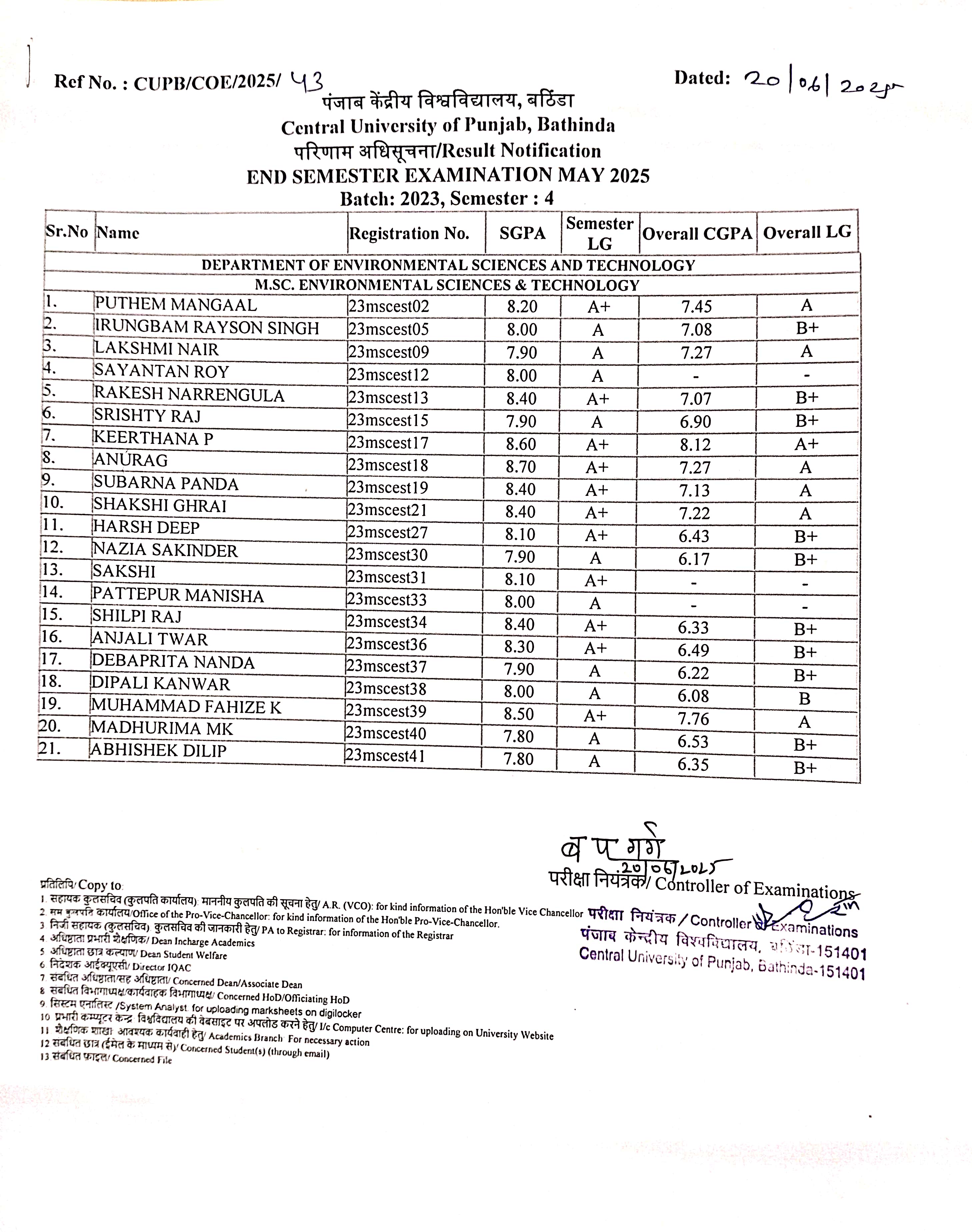 Supplementary End Semester Examination Result January 2025 (Batch 2022, Semester - 1)
