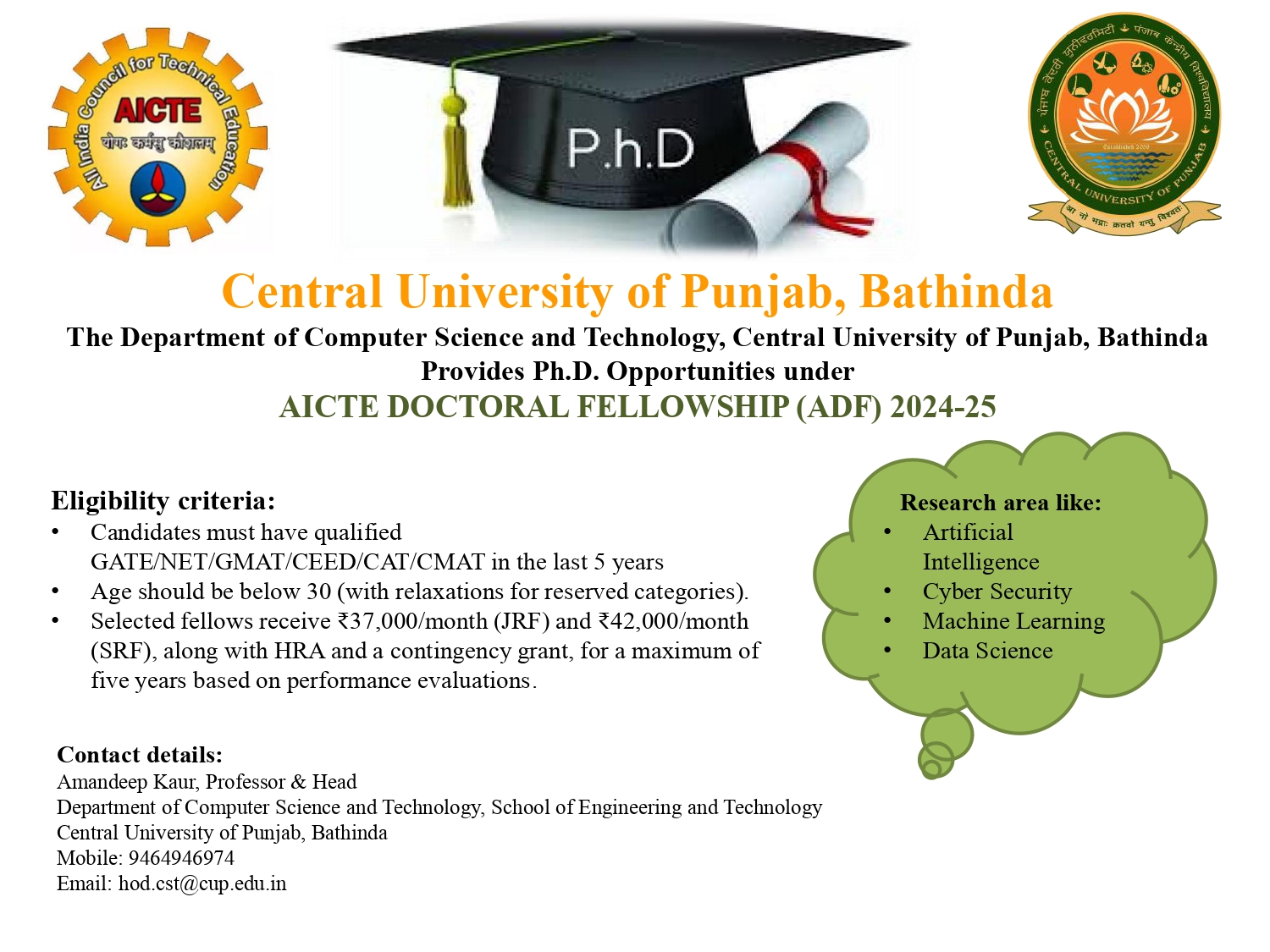 The Deprtment of Computer Science and Technology offers admission to M.Tech. programme in Computer Science and Technology and in Cyber Security.The objective of the programme is to impart advanced computer technology education to bridge the gap between industry and academia. The centre has well equipped state of the art Software Laboratory, Cyber Security and Research Laboratory for academics and research purposes. The unique environment of the centre encourages interdisciplinary research to solve problems beyond the scope of a single discipline. The aim of the centre is to focus on various research areas like wireless networks and their security, cloud computing, mobile computing, software engineering and image processing.