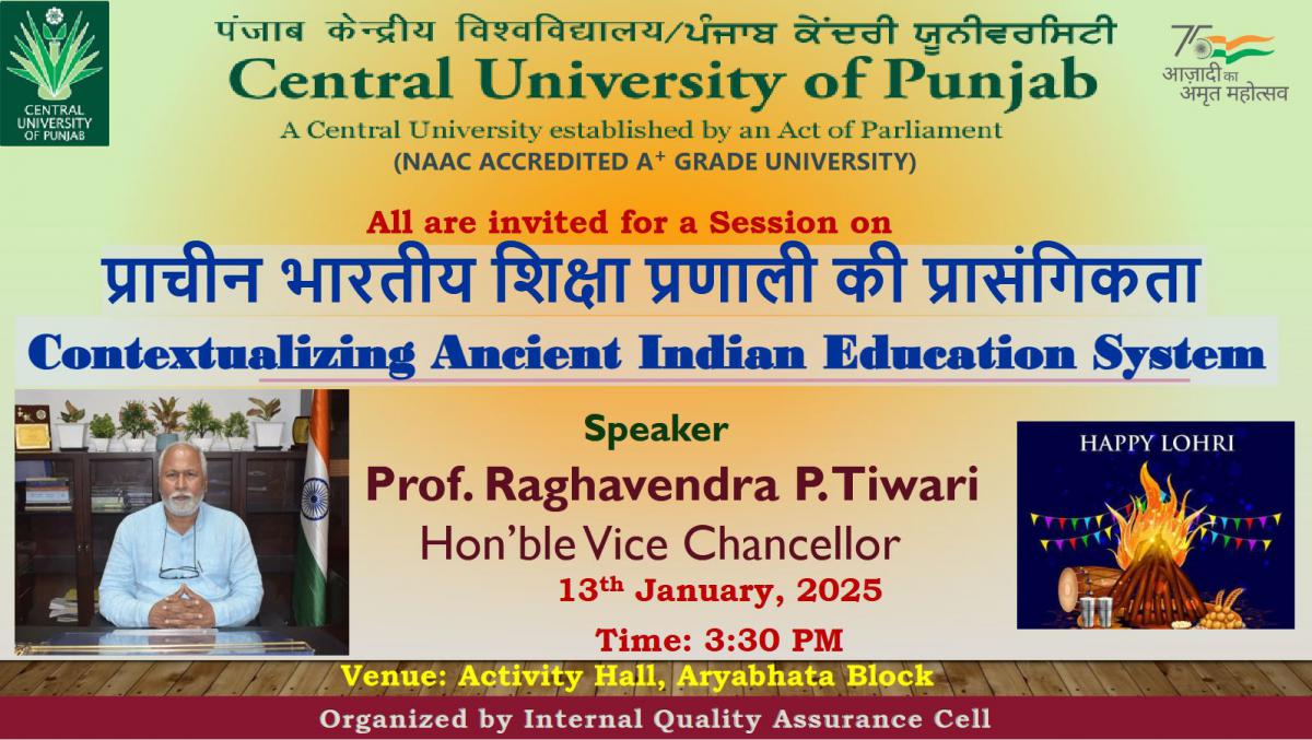 January 13, 2025 प्रोफेसर राघवेंद्र पी.तिवारी, माननीय कुलपति द्वारा प्राचीन भारतीय शिक्षा प्रणाली को प्रासंगिक बनाने पर सत्र Session on Contextualizing Ancient Indian Education System by Prof. Raghavendra P.Tiwari Hon’ble Vice Chancellor |