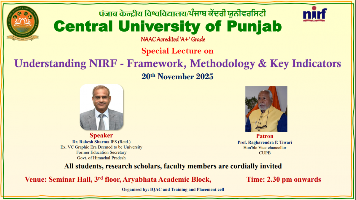 November 20, 2025 एनआईआरएफ को समझने पर विशेष व्याख्यान - रूपरेखा, कार्यप्रणाली और प्रमुख संकेतक Special Tecture on Understanding NIRF - Framework, Methodology & Key Indicators |