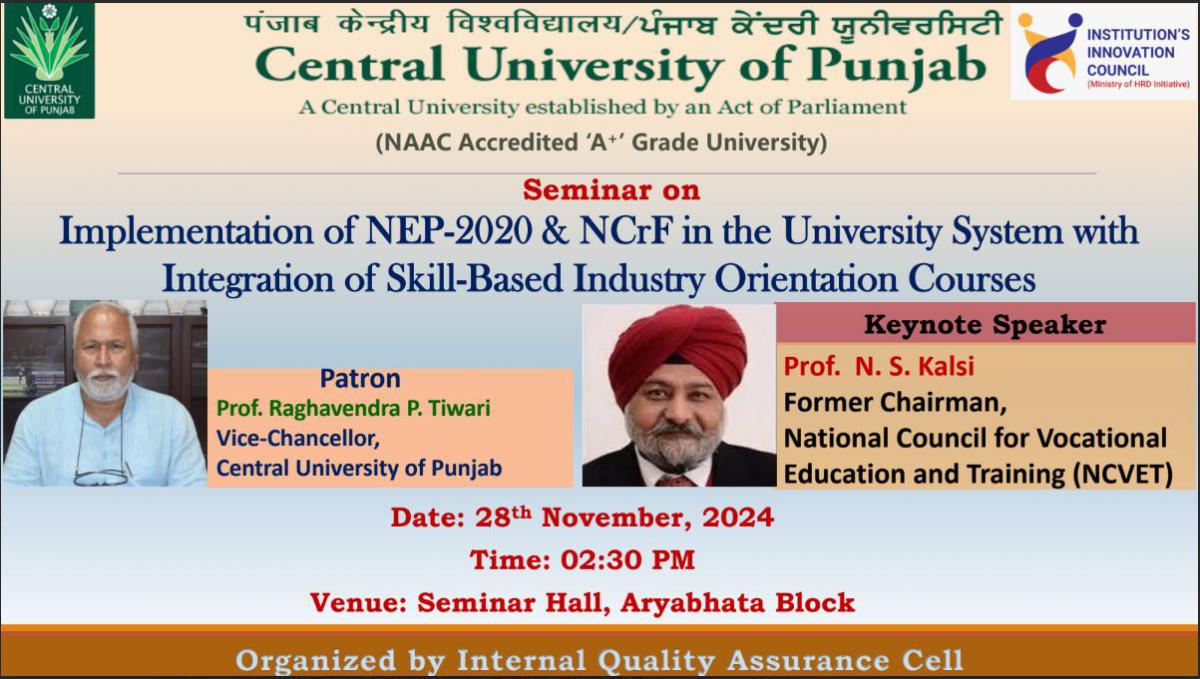 November 28, 2024 विश्वविद्यालय प्रणाली में एनईपी-2020 और एनसीआरएफ का कार्यान्वयन कौशल- आधारित उद्योग उन्मुखीकरण पाठ्यक्रमों का एकीकरण Implementation of NEP-2020 & NCrF in the University System with Integration of Skill-Based Industry Orientation Courses