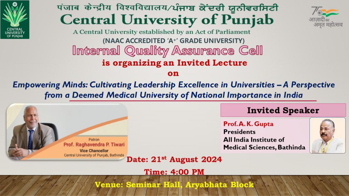 August 21, 2024 दिमाग को सशक्त बनाना: विश्वविद्यालयों में नेतृत्व उत्कृष्टता का विकास - भारत में राष्ट्रीय महत्व के एक डीम्ड मेडिकल विश्वविद्यालय से एक परिप्रेक्ष्य पर आमंत्रित व्याख्यान Invited Lecture on Empowering Minds: Cultivating Leadership Excellence in Universities – A Perspective from a Deemed Medical University of National Importance in India by Prof. A. K. Gupta