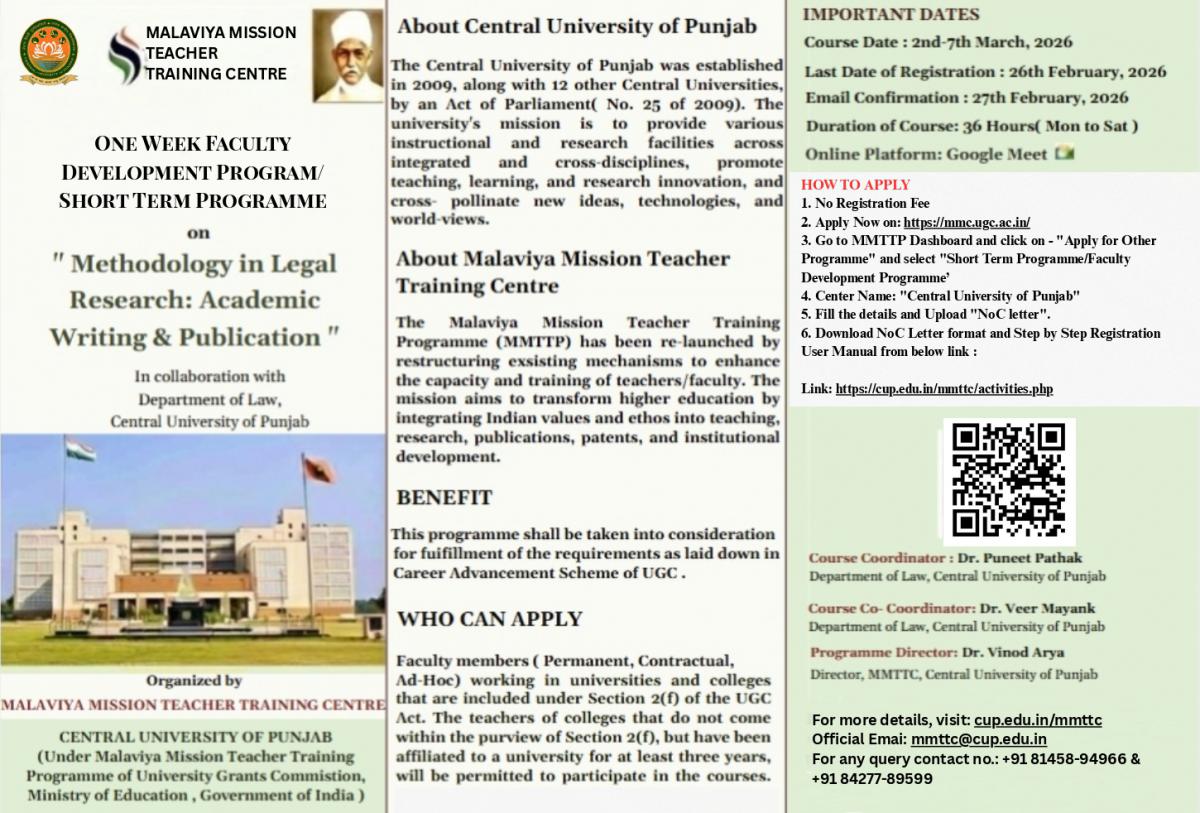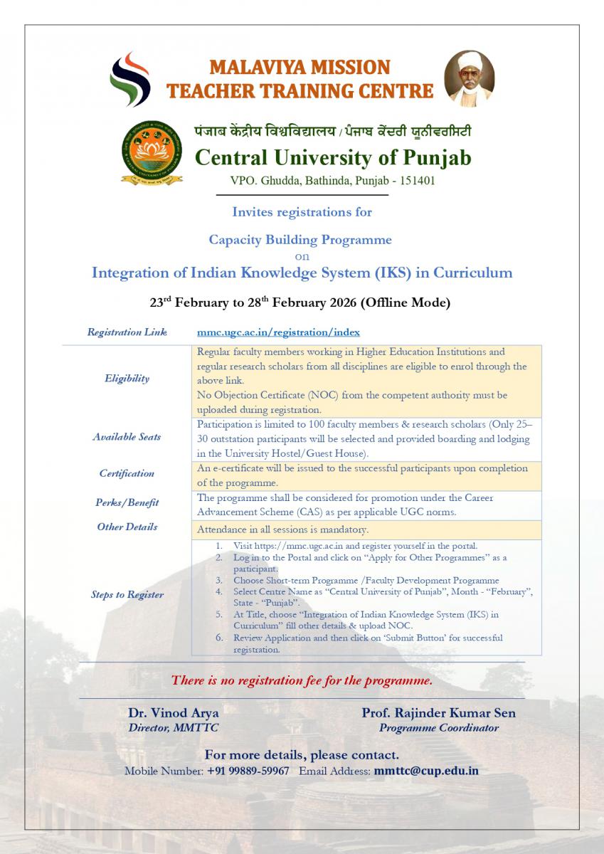 The UGC–Malaviya Mission Teacher Training Centre (MMTTC), Central University of Punjab, Bathinda invites applications for a one-week Capacity Building Programme on Integration of Indian Knowledge System (IKS) in Curriculum. The programme aims to sensitise faculty members and research scholars about the relevance of Indian Knowledge Systems in contemporary higher education and curriculum design.