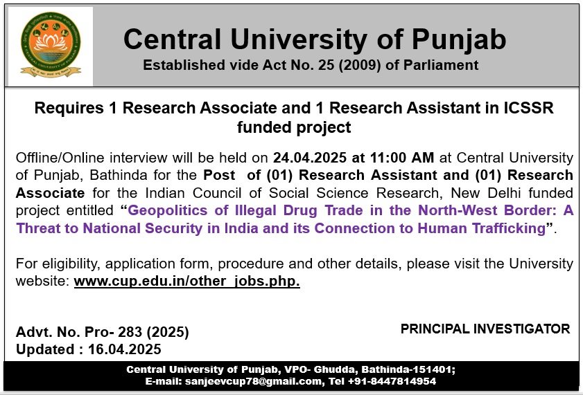 | Pro-166 (2022)Offline/Online interview will be held on 22.07.2022 at 10:00 AM at Central University of Punjab, Village Ghudda, Bathinda for (01) one post of Research Assistant for ICSSR funded project entitled, “Reshaping of the Asian Power Dynamics: An Analysis of Russo-Pak Rapprochement”. | |