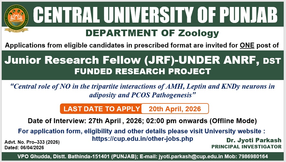 Advertisement No. PRO-312 dated 26.11.2025 : Applications are invited on purely project based temporary positions for Partnerships for Accelerated Innovationand Research (PAIR) Network titled “JNU-PAIR network on Science for Sustainable Future” under ANRF- PAIR scheme at Central University of Punjab (CUP), Bathinda as spoke institution ![]() |