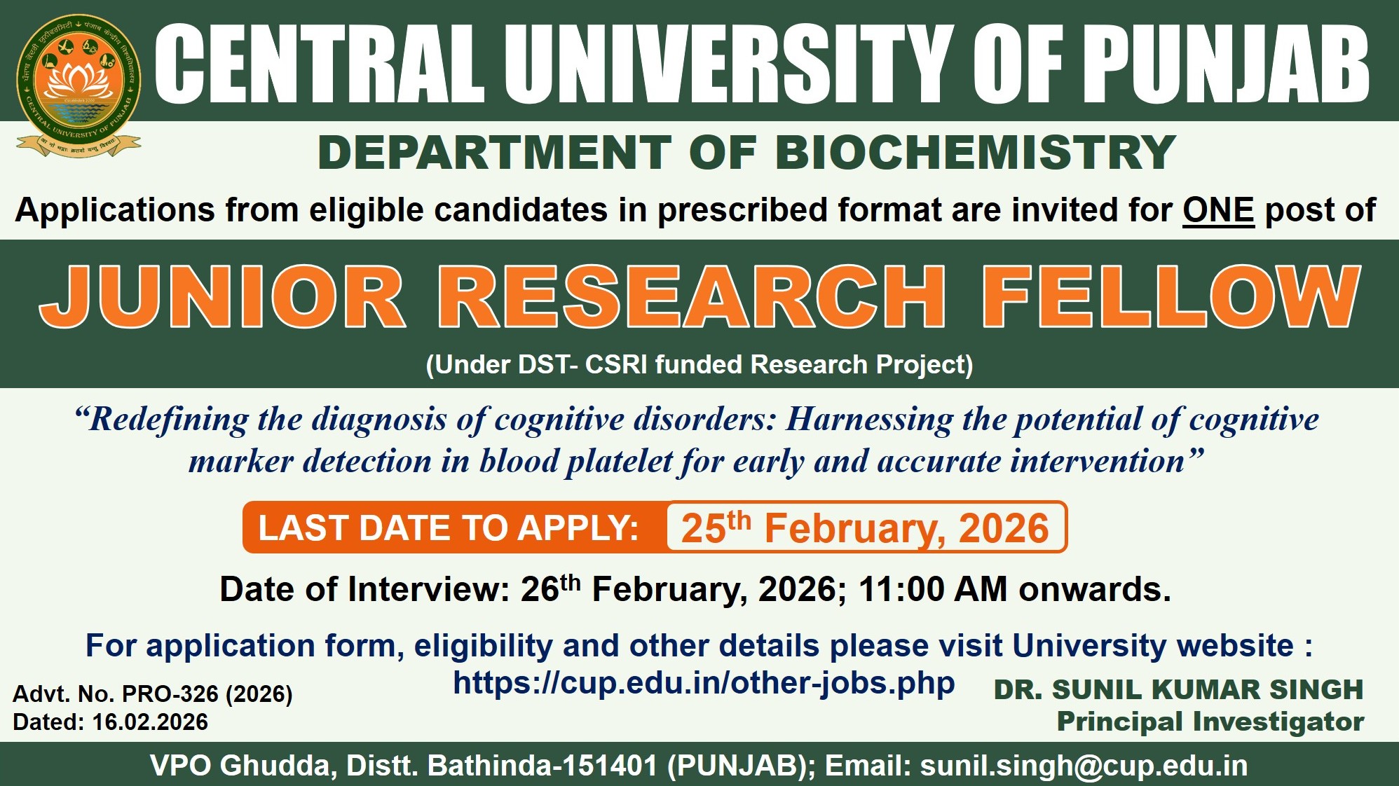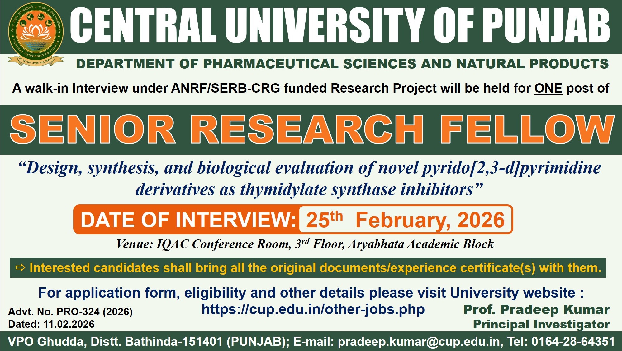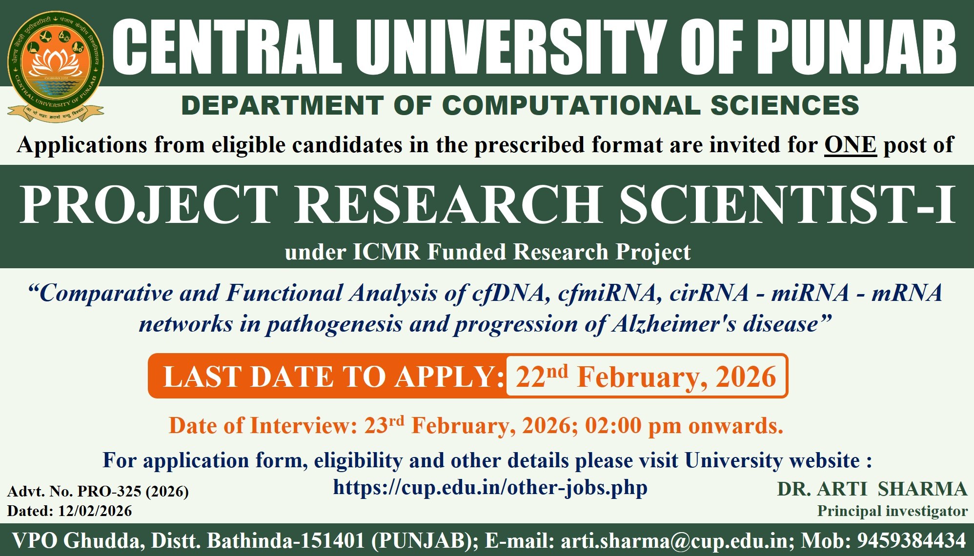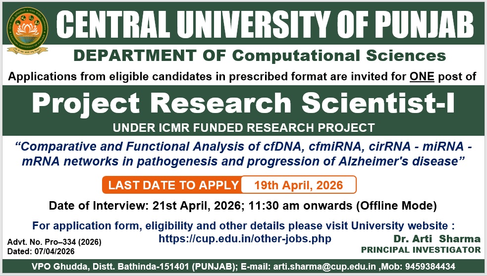 | CUPB/R&D/2025-26/292 Dated: 17.07.2025 A Walk-in interview will be held on 24th July, 2025 at 10:00 AM onwards in the IQAC Commitee Room, 3rd Floor, Aryabhatta Academic Block, Central Univeristy of Punjab, VPO Ghudda, Distt. Bathinda for Project Titled Multiomics approach to decipher the mechanism involved in breast cancer development, progression and development of novel therapeutic strategies under DST PURSE research Project | |