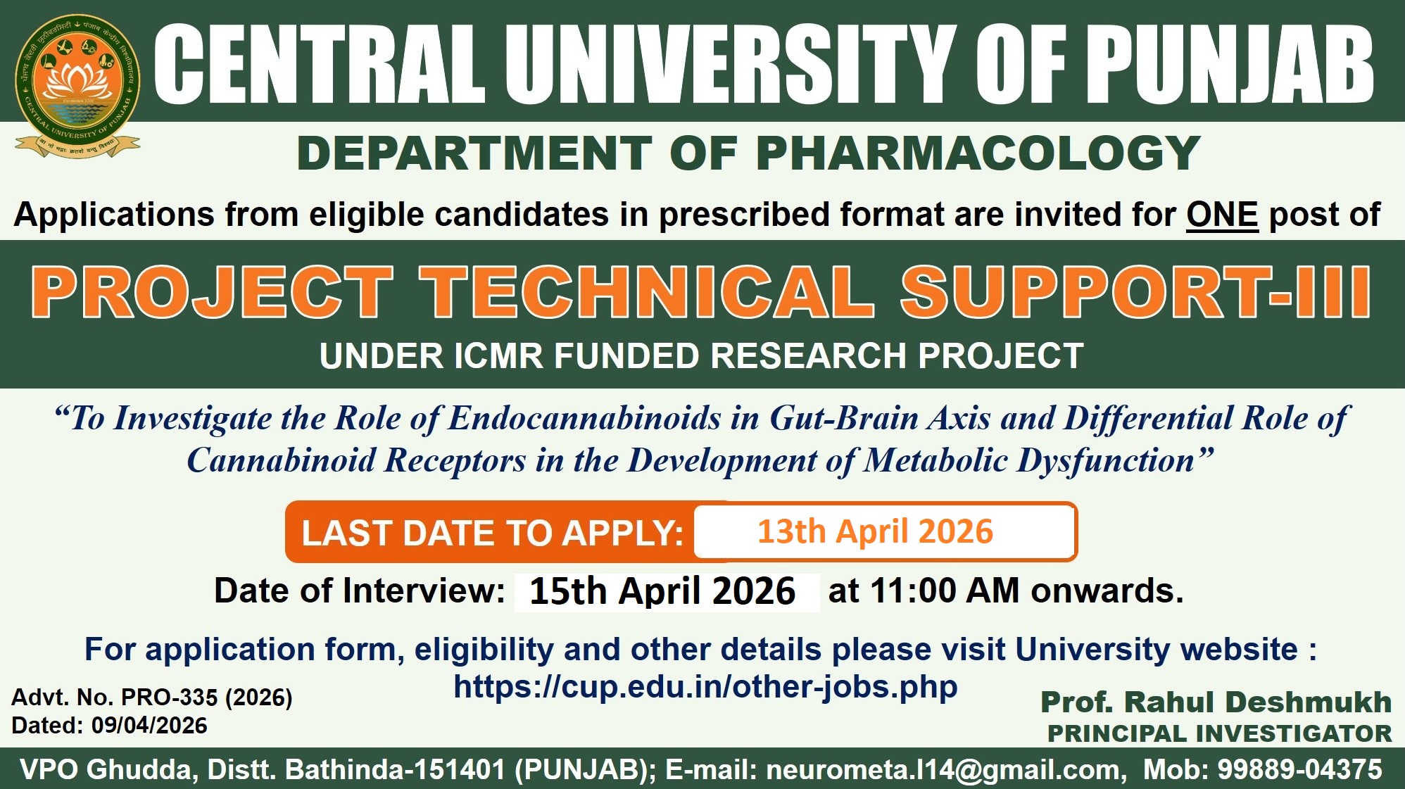 | Advertisement No. PRO-310 dated 14.10.2025 : Applications are invited in the project titled To Investigate the Role of Endocannabinoids in Gut-Brain Axis and Differential Role of Cannabinoid Receptors in the Development of Metabolic Dysfunction | |