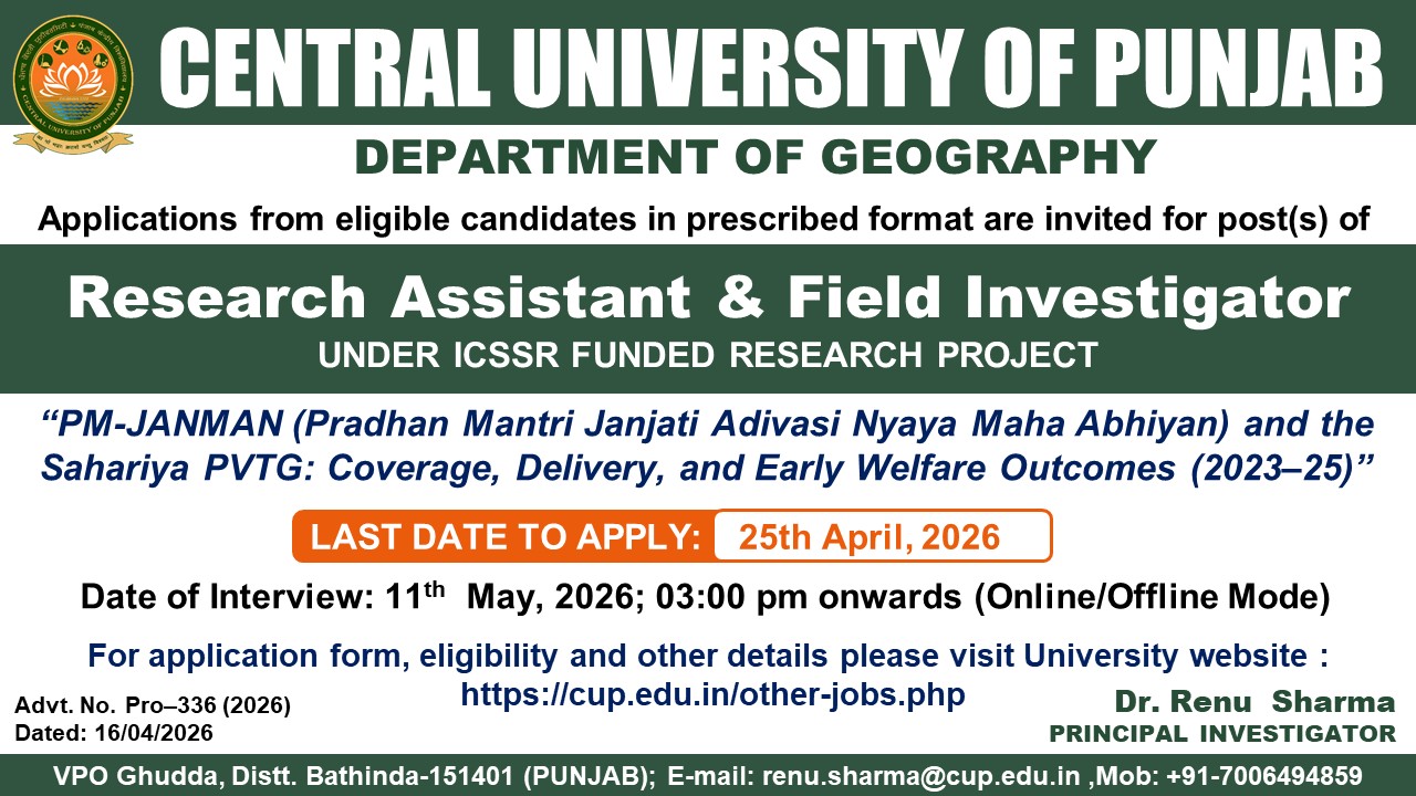 | Advt. No: PRO-291(2025) Dated: 17.07.2025 A Walk-in /Online Interview will be held on 1st August, 2025 at 11:00 AM onward for the position of Research Assciate on short term basis in the project titled Re-examining the Socio-Economic Externalities of Ground Water Depletion in Central Punjab: Possibilities and Challenges | |