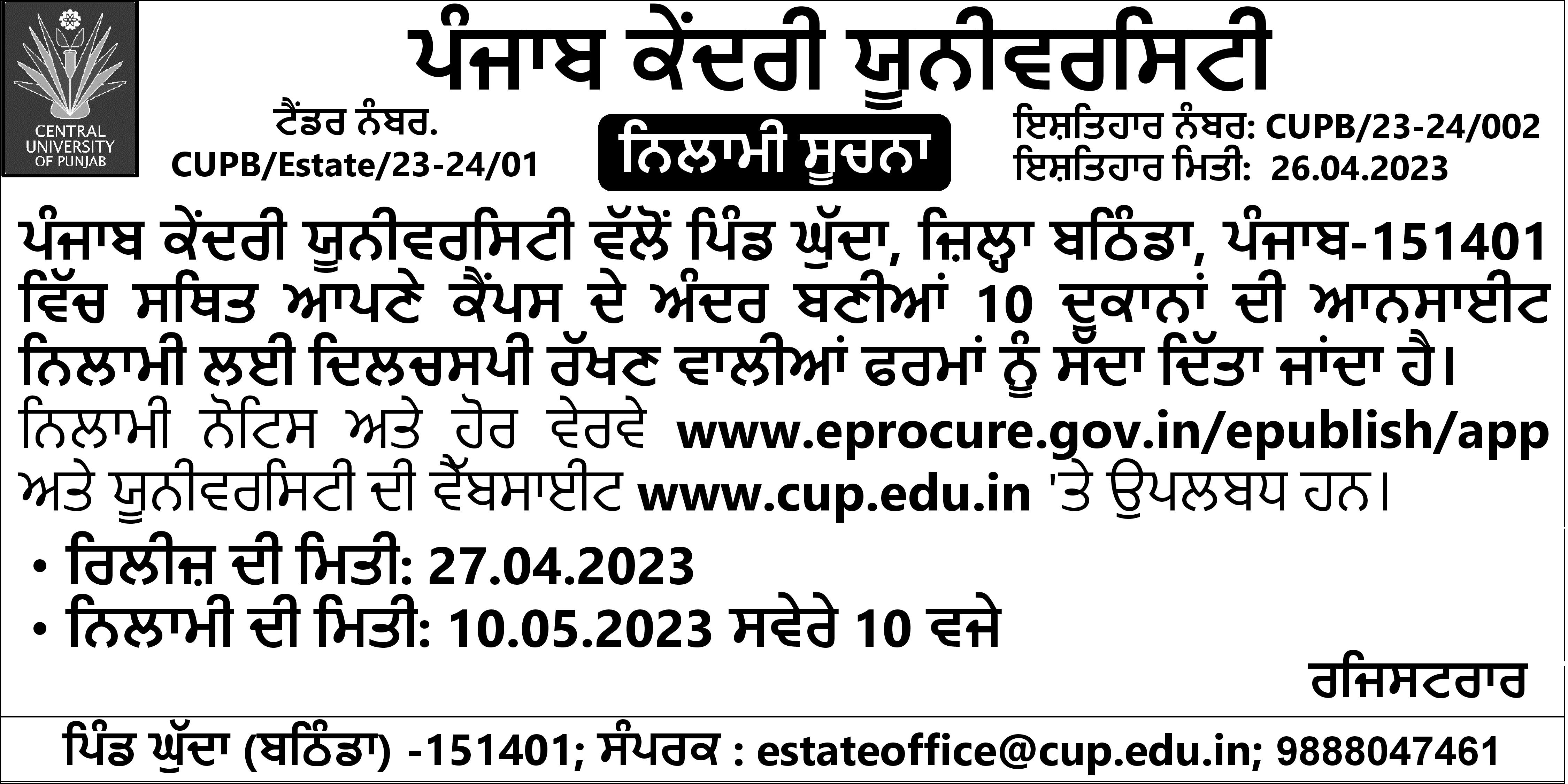 Tender no CUPB/Est./25/01 dated 27.10.25 for "Auction of 99 dried trees at various sites in Central University of Punjab campus, VPO Ghudda |